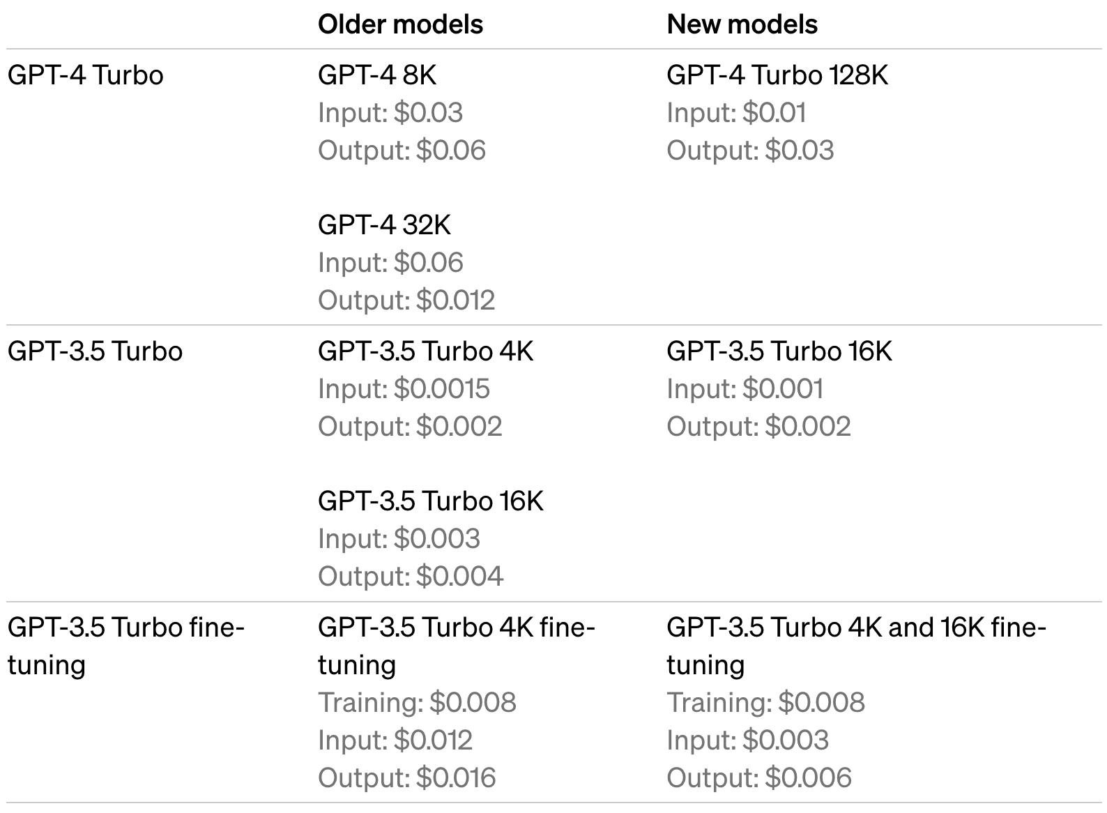An updated GPT-3.5 Turbo with 16K context was released. Various price decreases were announced, with GPT-3.5 Turbo input cost dropping 3x.