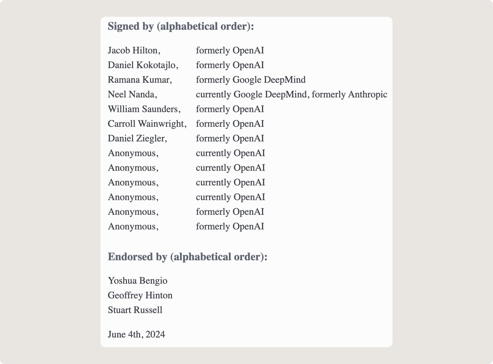 In an open letter published Tuesday, a group of current and former employees from leading artificial intelligence companies, including Anthropic, Google DeepMind and OpenAI, expressed concerns about the lack of safety oversight within the AI industry. The letter, titled "A Right to Warn about Advanced Artificial Intelligence," calls for increased protections for whistleblowers and greater transparency from AI companies regarding the potential risks associated with their technologies.
