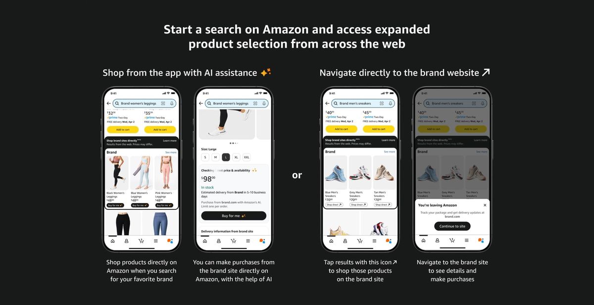 The feature works by displaying products from external retailers under a "Shop brand sites directly" section when users search for items unavailable on Amazon. Users can tap on these listings to view product details, and if they decide to purchase, they simply hit the "Buy for Me" button. Amazon's AI then securely provides the customer's encrypted name, address, and payment details to complete the checkout process on the brand's website.