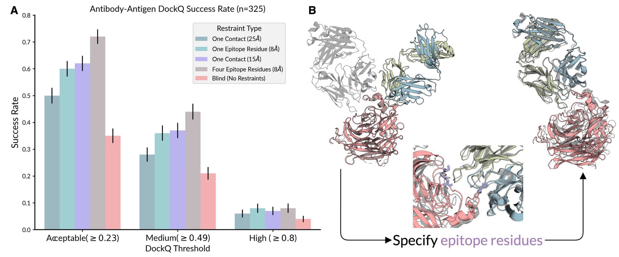 The model can also incorporate experimental constraints, such as data from epitope mapping or cross-linking mass spectrometry. When provided with these constraints, Chai-1's performance improves significantly, enhancing applications like antibody engineering, where the accuracy of antibody-antigen structure prediction can double with the use of even minimal contact data. Researchers can prompt the model with new data to refine predictions in real-time, making it a highly adaptive tool for complex biochemical studies.