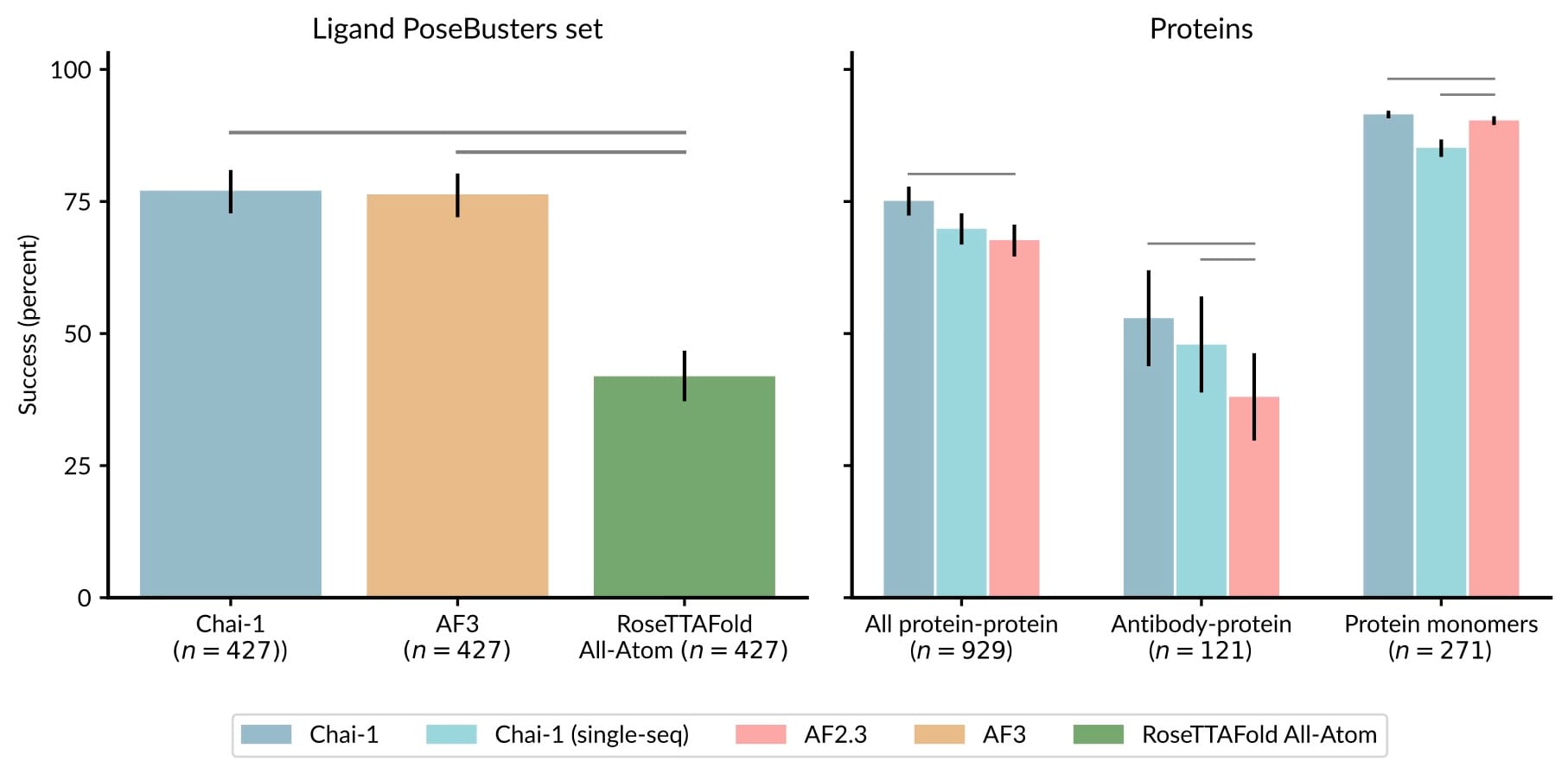 Chai-1 enables unified prediction of proteins, small molecules, DNA, RNA, and other biomolecular structures. It matches or exceeds the performance of leading models like AlphaFold 3 on several benchmarks. On the challenging PoseBusters protein-ligand benchmark, Chai-1 achieves a 77% success rate, comparable to AlphaFold 3's 76%.