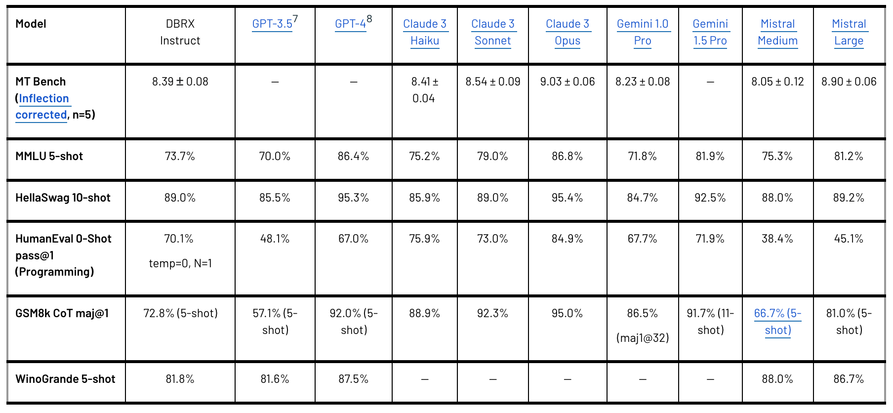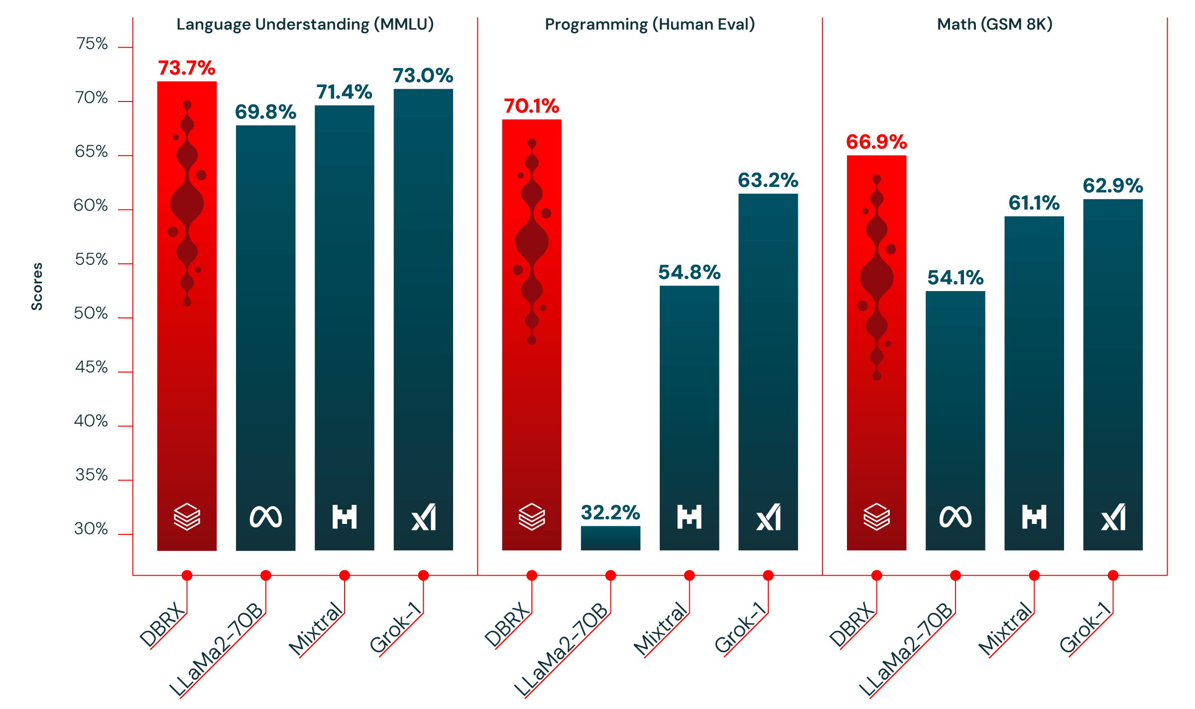 DBRX stands out for its impressive performance, surpassing models like LLaMA2-70B, Mixtral, and Grok-1 in language understanding, programming, math, and logic tasks. According to Databricks' open-source benchmark Gauntlet, DBRX leads in over 30 distinct state-of-the-art benchmarks, showcasing the continued improvement in the quality of open-source models.