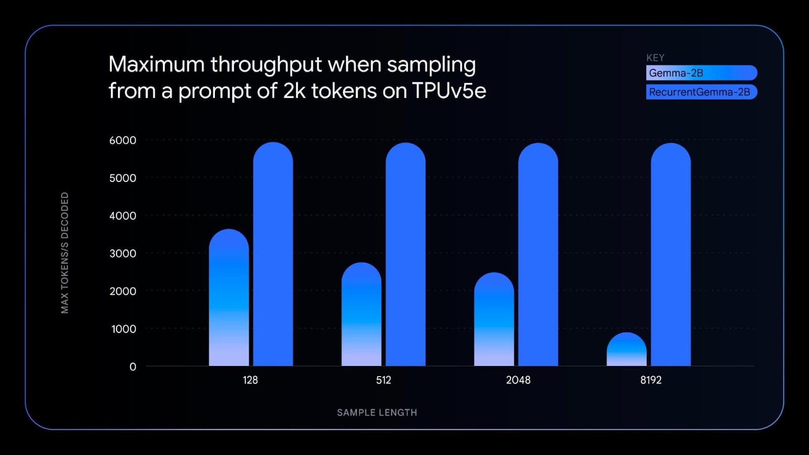 The second variant, RecurrentGemma, leverages recurrent neural networks and local attention for improved memory efficiency. While achieving similar benchmark scores to the Gemma 2B model, its unique architecture reduces memory usage, enables higher throughput, and allows for longer sample generation on resource-constrained devices. RecurrentGemma's ability to maintain sampling speed regardless of sequence length sets it apart from Transformer-based models like Gemma, which slow down with longer sequences. This model variant showcases advancements in deep learning research with a non-transformer architecture.