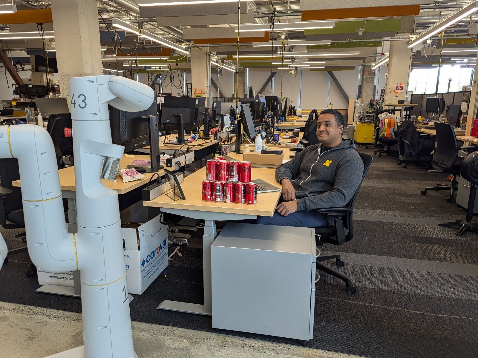 For example, a user with empty soda cans on their desk asks if their favorite drink is in stock. The robot figures out it needs to: