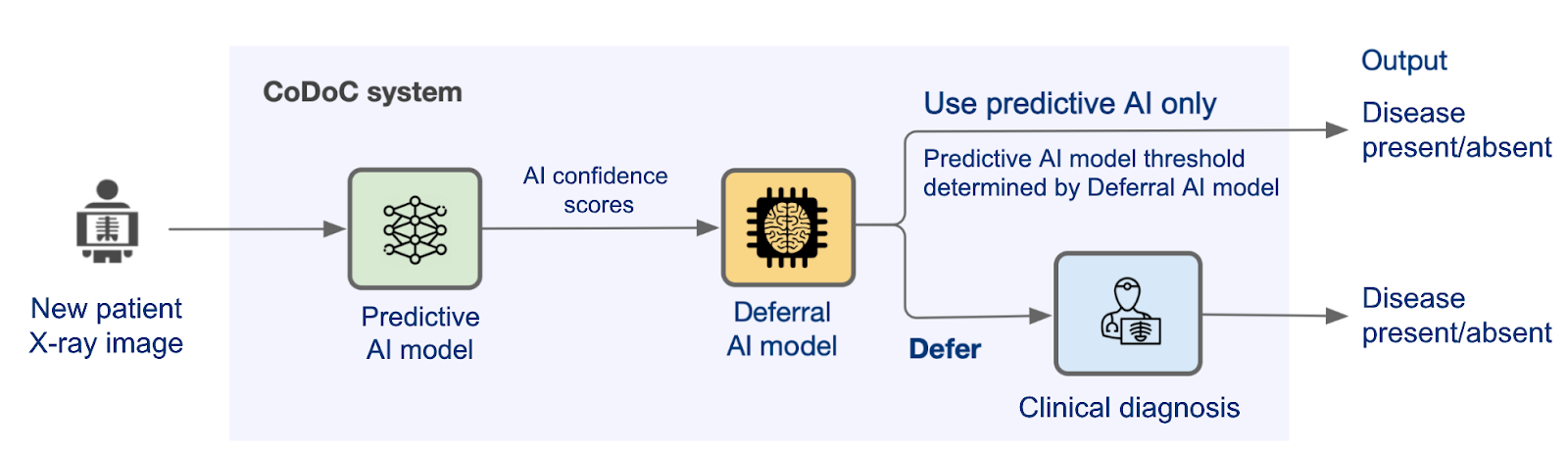 CoDoC represents an evolution in building more reliable AI systems. It is intended to be an add-on tool for human-AI collaboration. It does this not by re-engineering predictive models, which is an onerous task that most healthcare providers cannot accomplish, but by learning from these systems' decisions and accuracy when working with human clinicians. It was designed to meet three critical criteria: