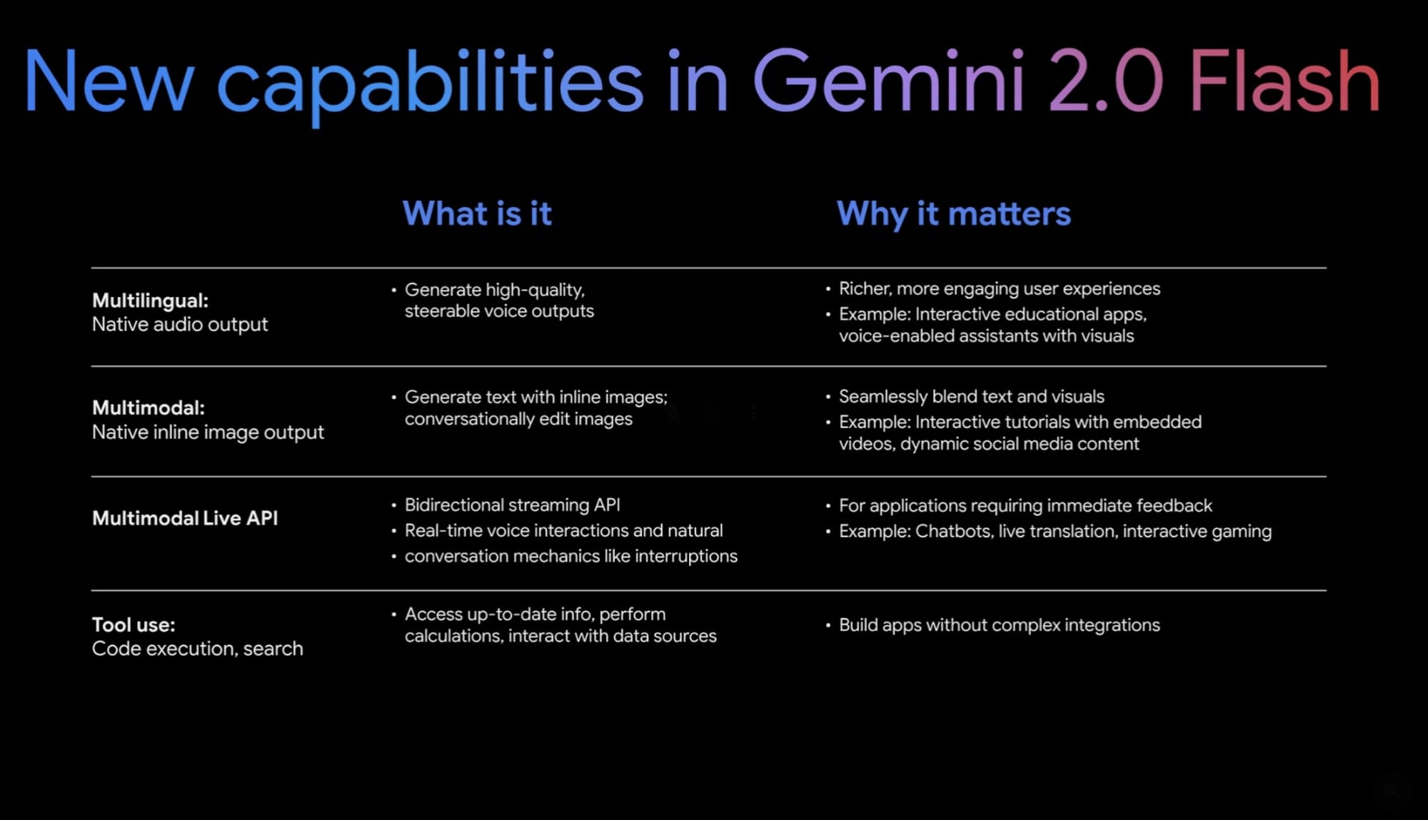 - Multimodal Live API: A bidirectional streaming API that supports real-time conversations with natural interaction patterns. This is similar to what you will find in Google's Project Astra and ChatGPT Advanced Voice Mode.