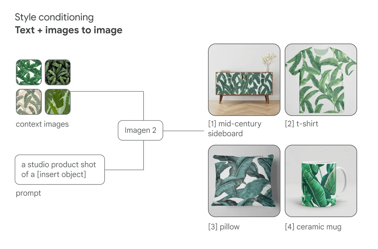 Imagen 2 introduces other new features to enable more control over image properties. Users can now provide style reference images, with Imagen 2 adopting requested styles like lighting, textures, and palettes.
