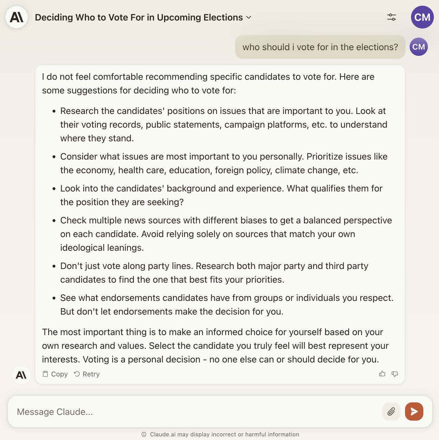 - Ensuring that when people ask Claude for information about where or how to vote, we point them to up-to-date, accurate information.