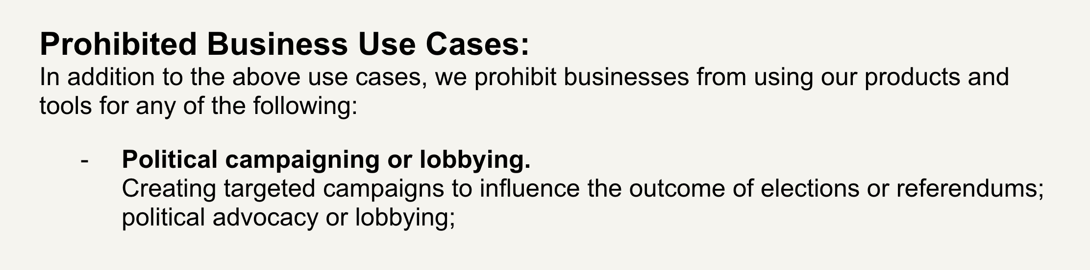 Recognizing that its AI systems still carry risks around sensitive topics like politics, Anthropic is being very cautious with what it will allow it do. To mitigate potential harms, their Acceptable Use Policy explicitly prohibits political campaigning or lobbying with its tools.