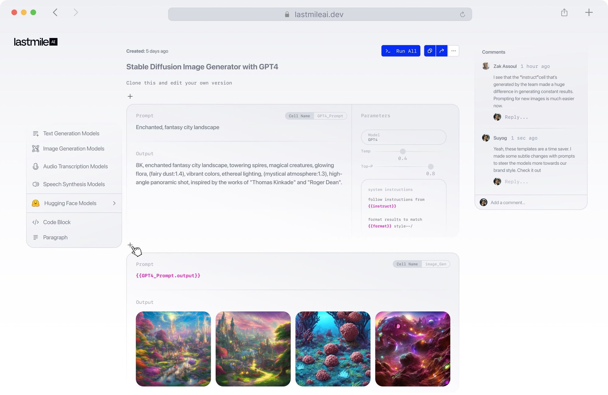 LastMile AI's main product is called AI Workbooks, which provides a notebook interface for easily iterating on and evaluating different natural language and image generation models. The company plans to build out its platform with tools for deploying models into production applications and monitoring their ongoing performance.