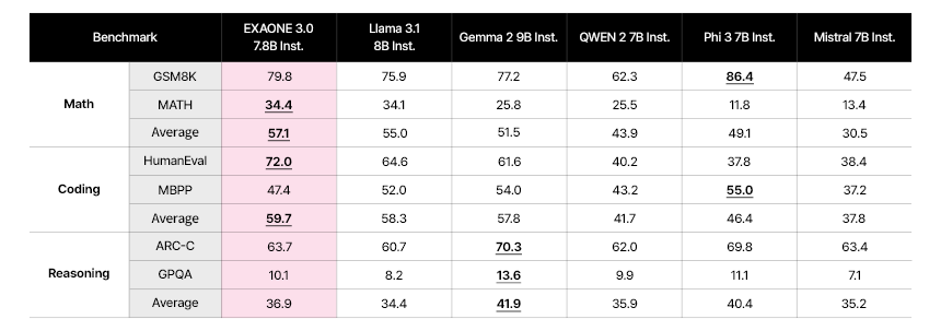 In benchmark tests, EXAONE 3.0 7.8B showed impressive performance across multiple categories: