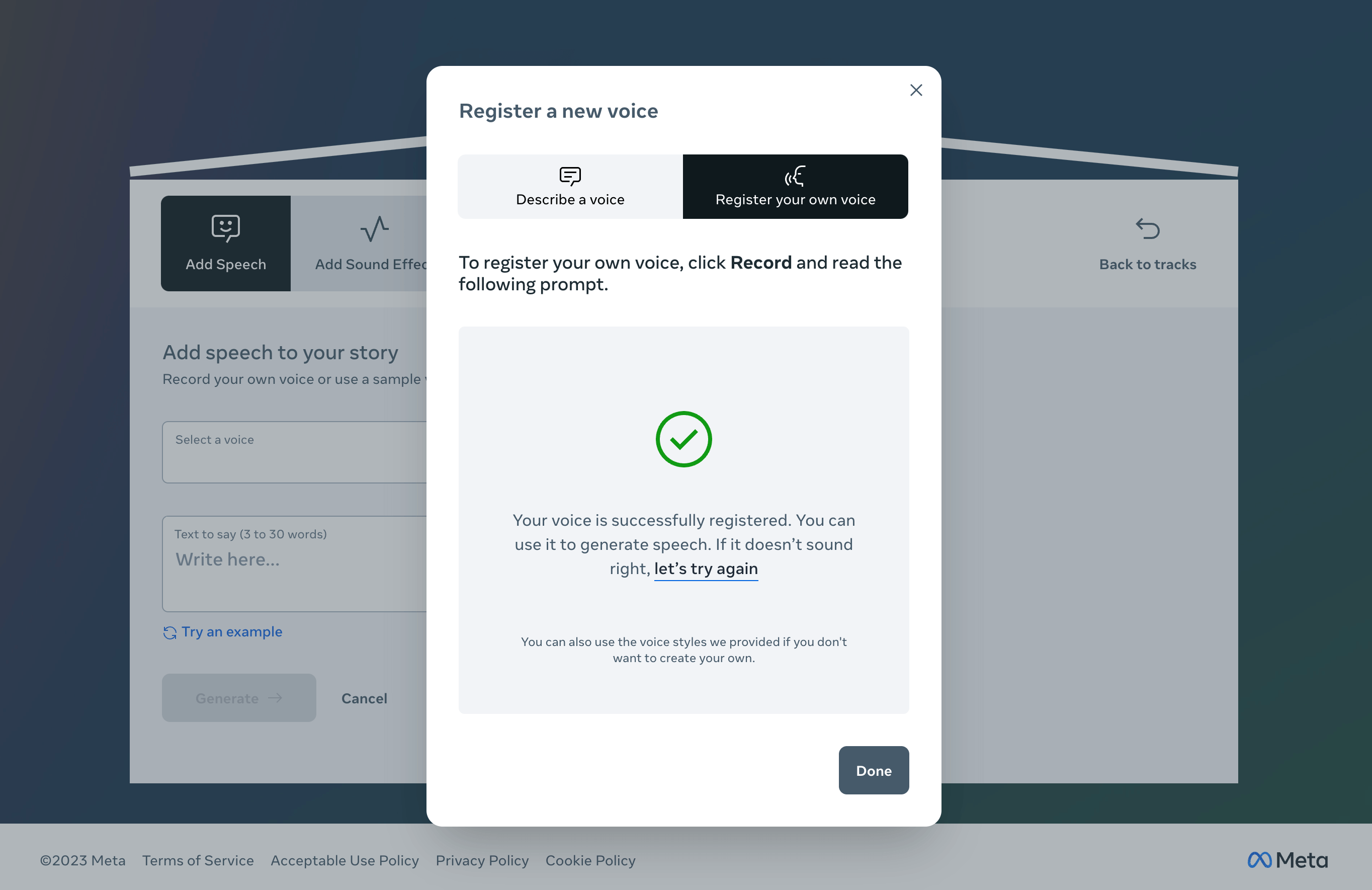 To get started, you must register a new voice to add speech to your story by either choosing to describe the characteristics of the voice (as well as the environment and any accompanying sounds) or recording your own.