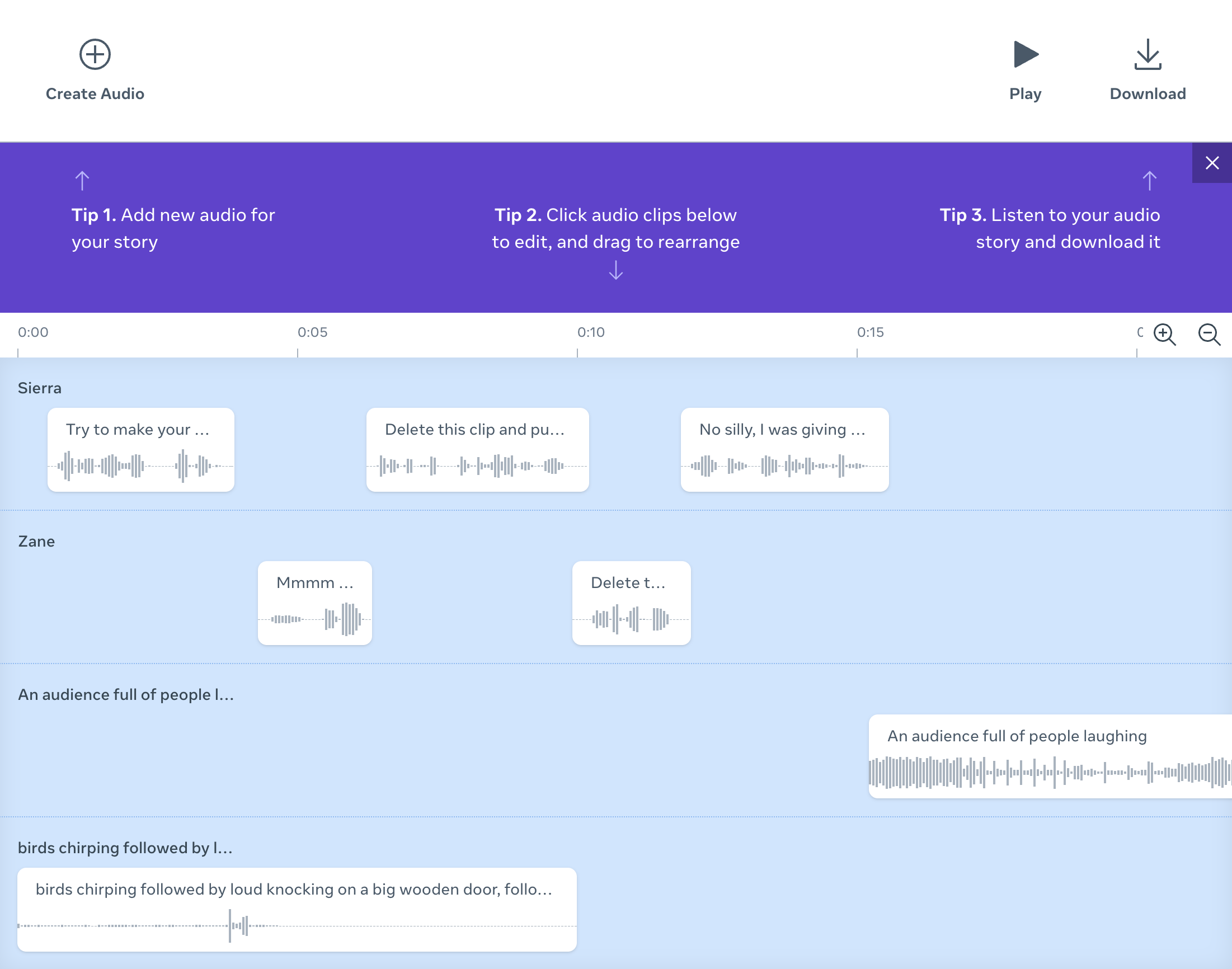 If you choose to record your own voice, the system generates a prompt that you must read within 50 seconds. You can add sound effects to your story by simply describing the characteristics of the sound you would like to create. You can also browse and re-use saved voices to maintain consistency for their story's characters.