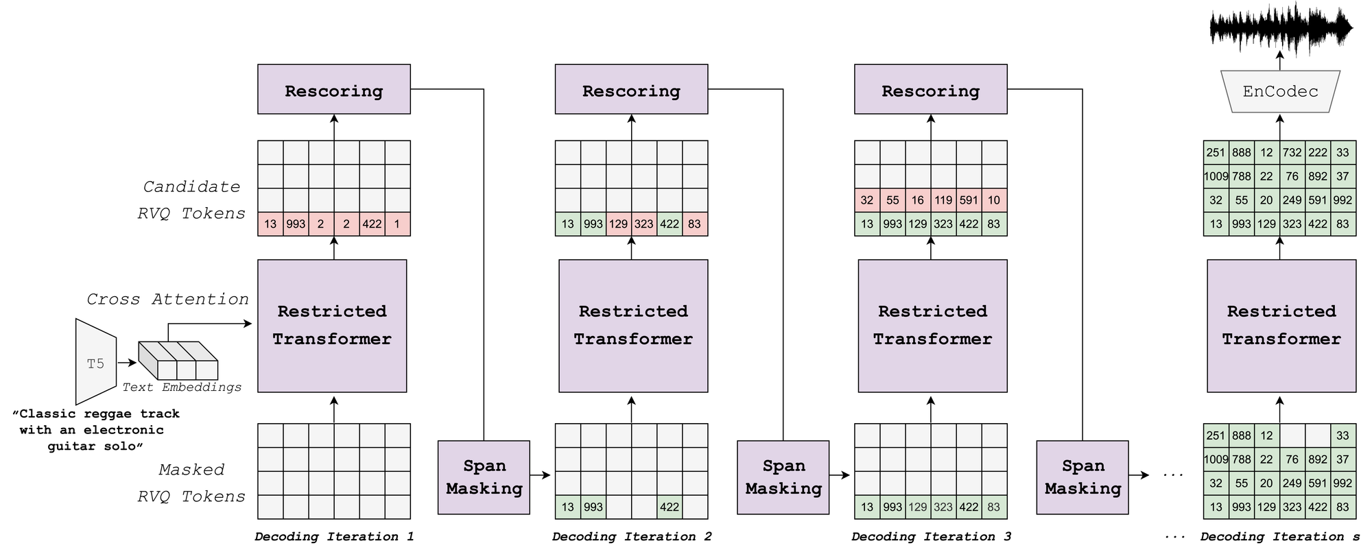 This impressive speed stem from its masked generative sequence modeling directly on raw audio waveform tokens. The model is composed of a single transformer that predicts spans of masked input conditioned on visible context in a series of non-autoregressive decoding iterations. A novel rescoring component then refines audio fidelity by leveraging an external pre-trained model to rescore and rank predictions, which are then utilized in subsequent decoding steps.
