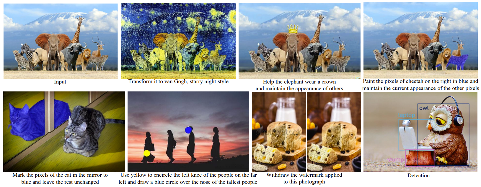 Specifically, the model is trained to modify input images according to textual instructions provided by the user. For example, an instruction could be "encircle the man's left shoulder in red" for keypoint detection or "apply a blue mask to the rightmost dog" for segmentation.
