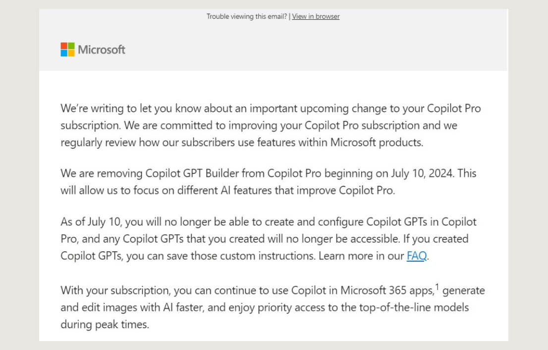 Microsoft has announced that it will be retiring its GPT Builder tool for Copilot Pro consumers, just three months after broadly rolling out the service. The company will remove the ability to create new GPTs starting July 10, 2024 and will delete all existing GPTs, including associated data, from July 10-14.
