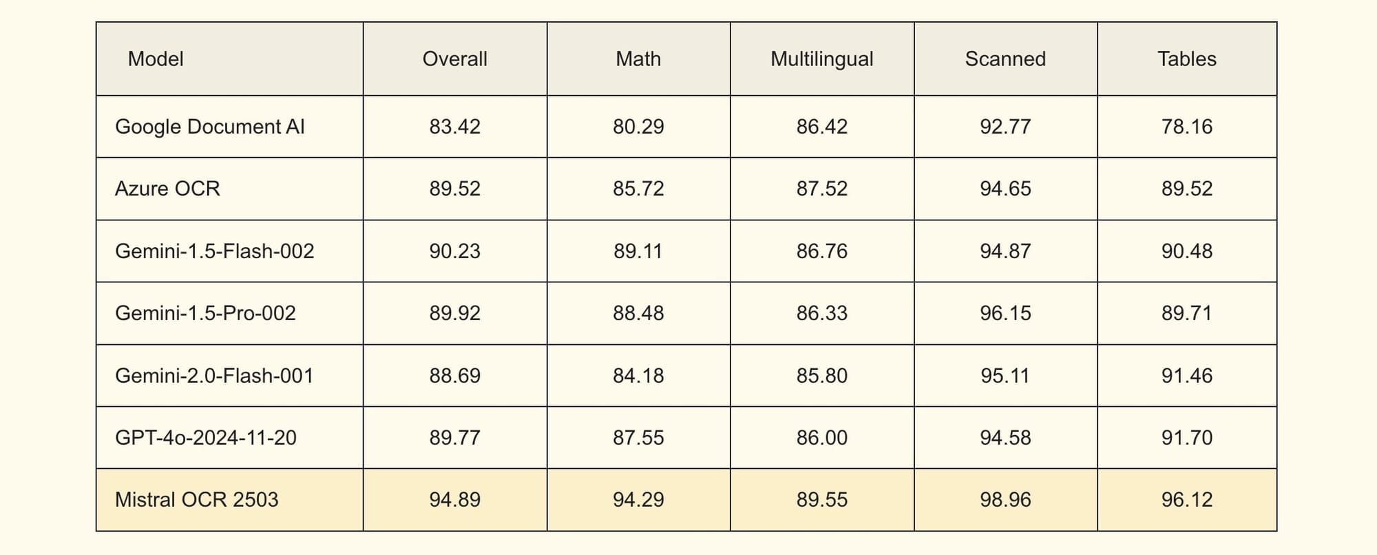 Mistral OCR consistently outperforms existing models in document recognition benchmarks. With an overall accuracy score of 94.89%, it beats Google Document AI, Azure OCR, and GPT-4o, particularly excelling in extracting math equations, scanned text, and structured tables.