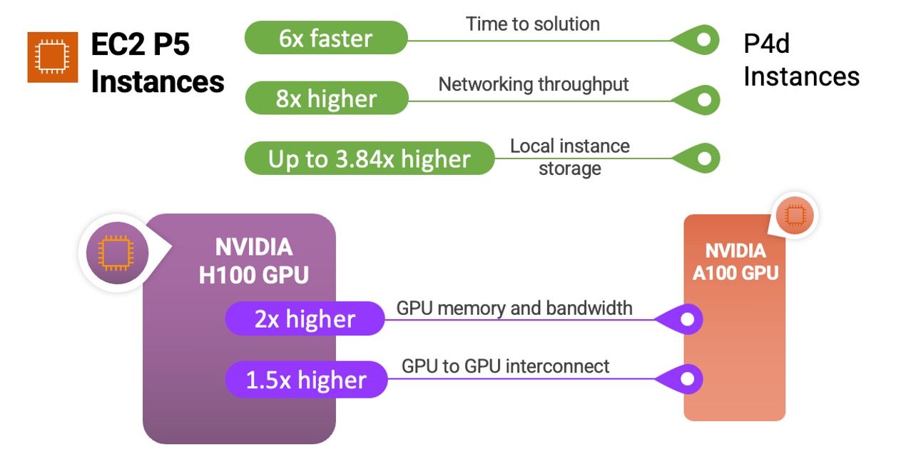 The new P5 instances, which offer eight NVIDIA H100 Tensor Core GPUs, 3rd Gen AMD EPYC processors, 2 TB of system memory, and 30 TB of local NVMe storage, are slated to reduce training time by up to six times compared to previous generation GPU-based instances. This leap in performance promises a 40 percent decrease in training costs for customers.