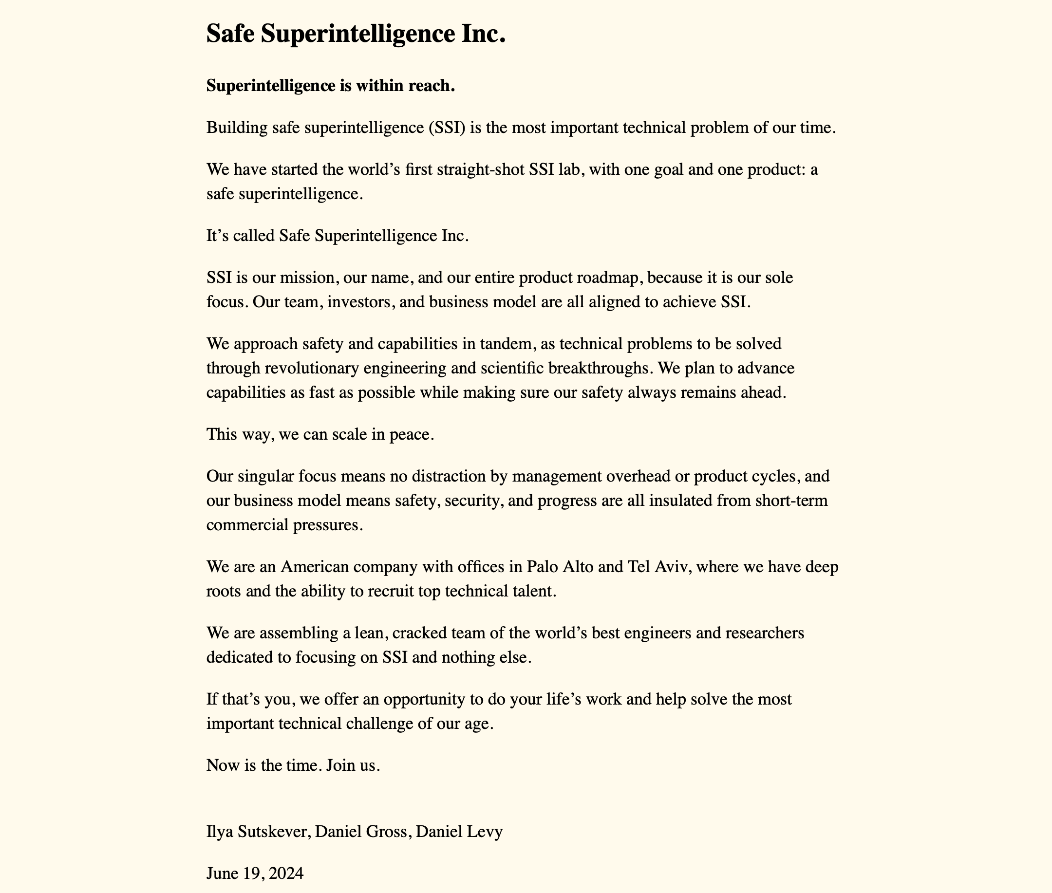 Well, whatever it was, it certainly has Sutskever convinced that really advanced AI systems are on the horizon. Today, a little over month since he departed OpenAI, Sutskever has announced the launch of his new venture, Safe Superintelligence Inc. (SSI). The company was incorporated in Delaware on June 6 and will have offices in Palo Alto and Tel Aviv.