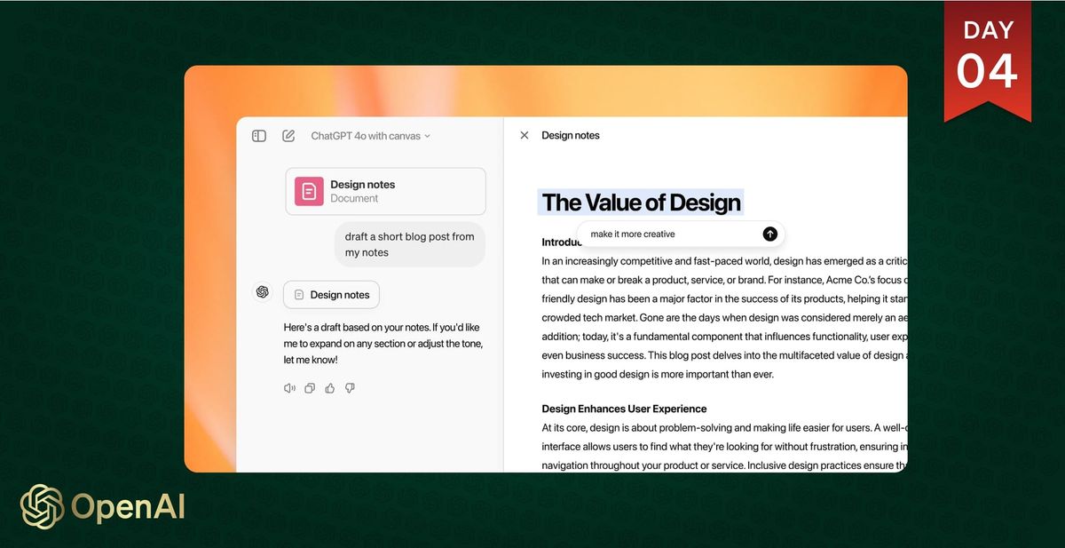 OpenAI has officially launched its ChatGPT Canvas feature out of beta, introducing a suite of new capabilities designed to enhance collaborative writing and coding directly within the ChatGPT interface. The announcement came during day four of OpenAI's "12 Days of Shipmas" event, where product lead Kevin Weil, alongside engineers Lee Byron and Alexi Christakis, demonstrated the enhanced features.