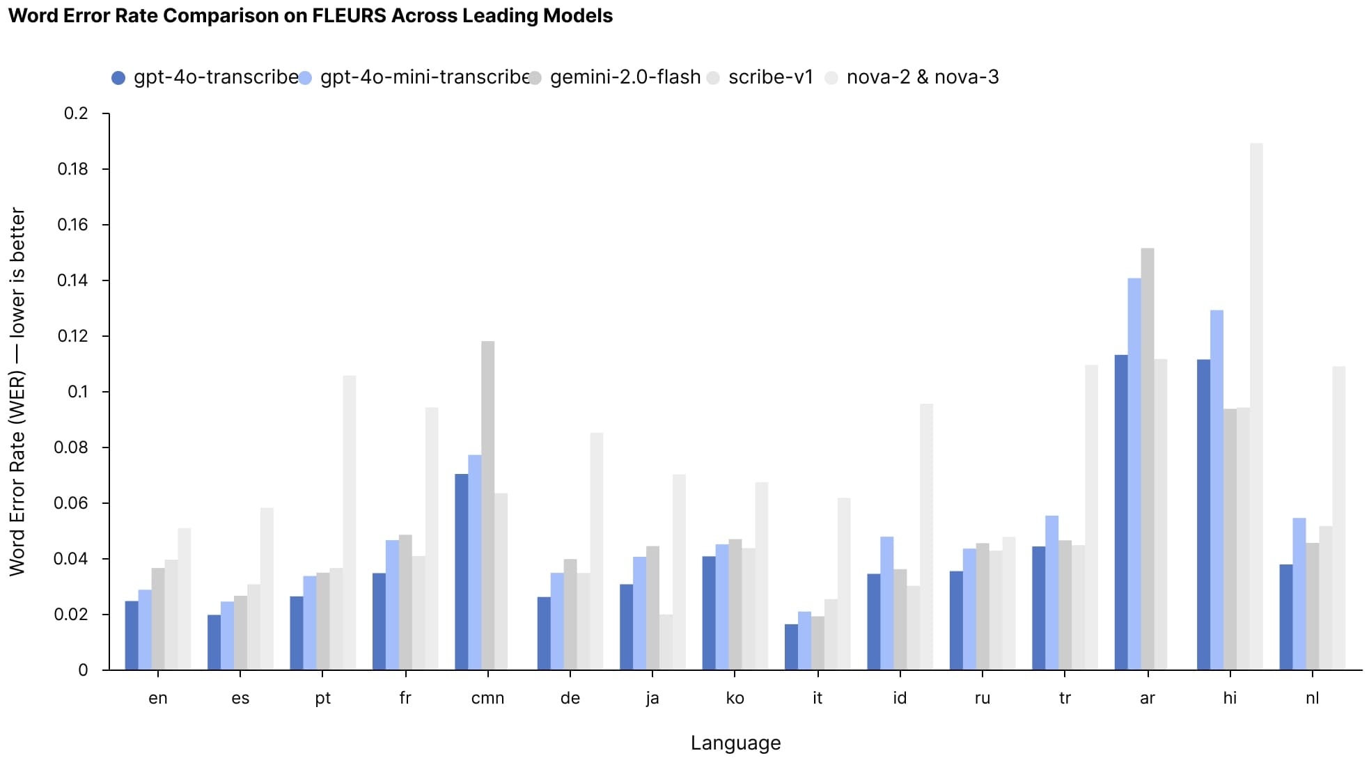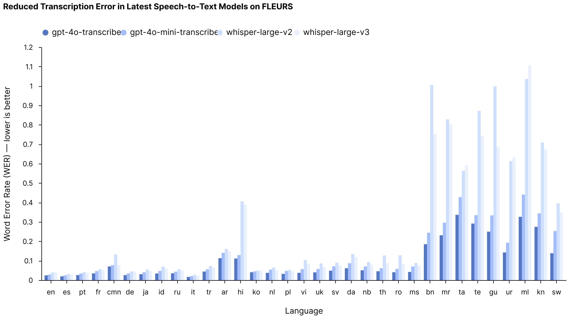 On the FLEURS multilingual speech benchmark, which tests transcription accuracy across more than 100 languages, both new models consistently outperformed not only OpenAI's previous Whisper offerings but also competing solutions from other companies.