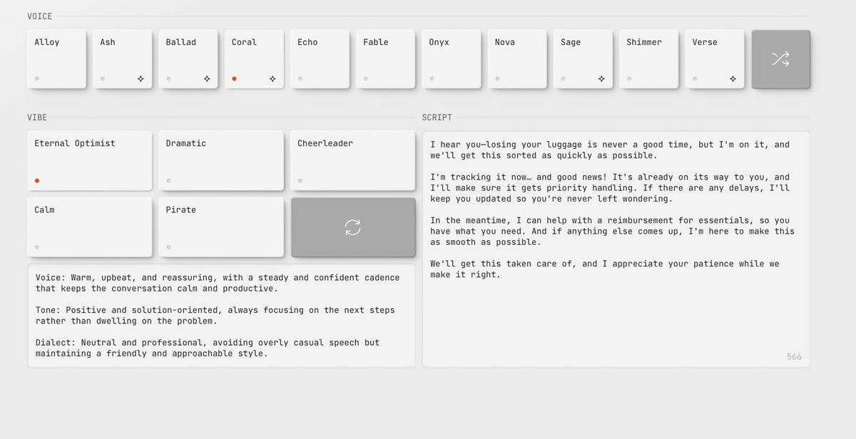 During a livestream demonstration, OpenAI engineer Iaroslav Tverdoklhib showed how developers can provide instructions like "speak like a mad scientist: high energy, chaotic" to dramatically change the delivery style of the same text. The company has launched openai.fm as an interactive demo site where developers can experiment with these voice variations.