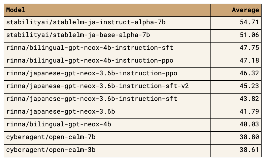 In benchmark testing using EleutherAI's lm-evaluation-harness , the Instruct model achieved the top score among Japanese language models with an average score of 54.71 across eight assessment tasks.