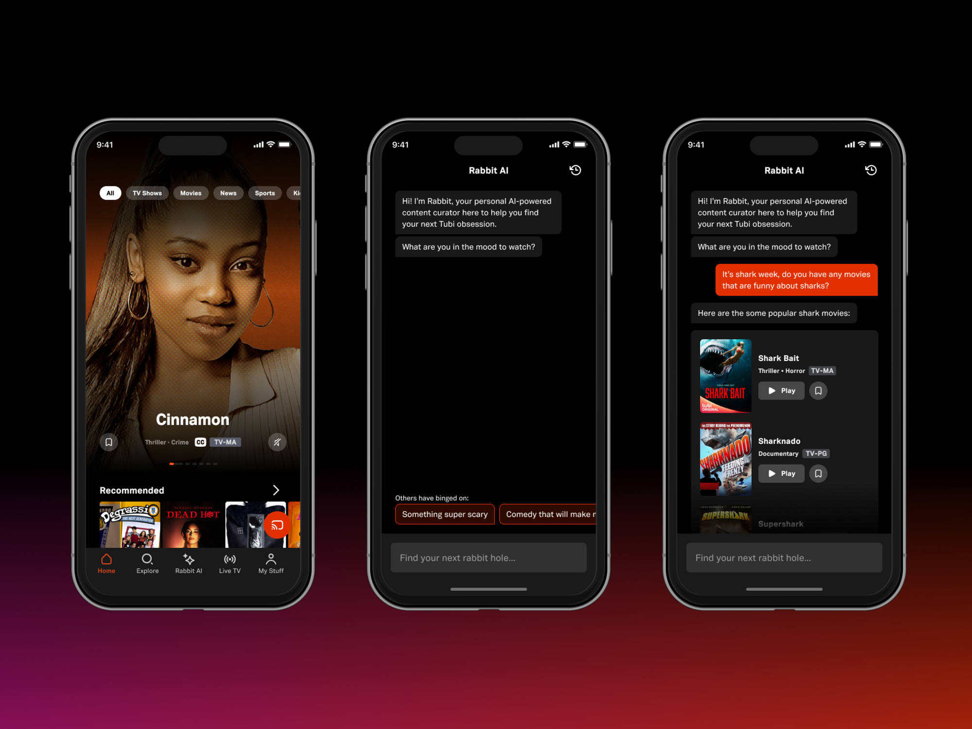 "At Tubi we're uniquely situated to find content for viewers that's specific to the moment they're in because of our large library and our personalization and machine learning algorithms," said Blake Bassett, Tubi's Senior Director of Product. "With Rabbit AI we're making the content discovery experience fun again."