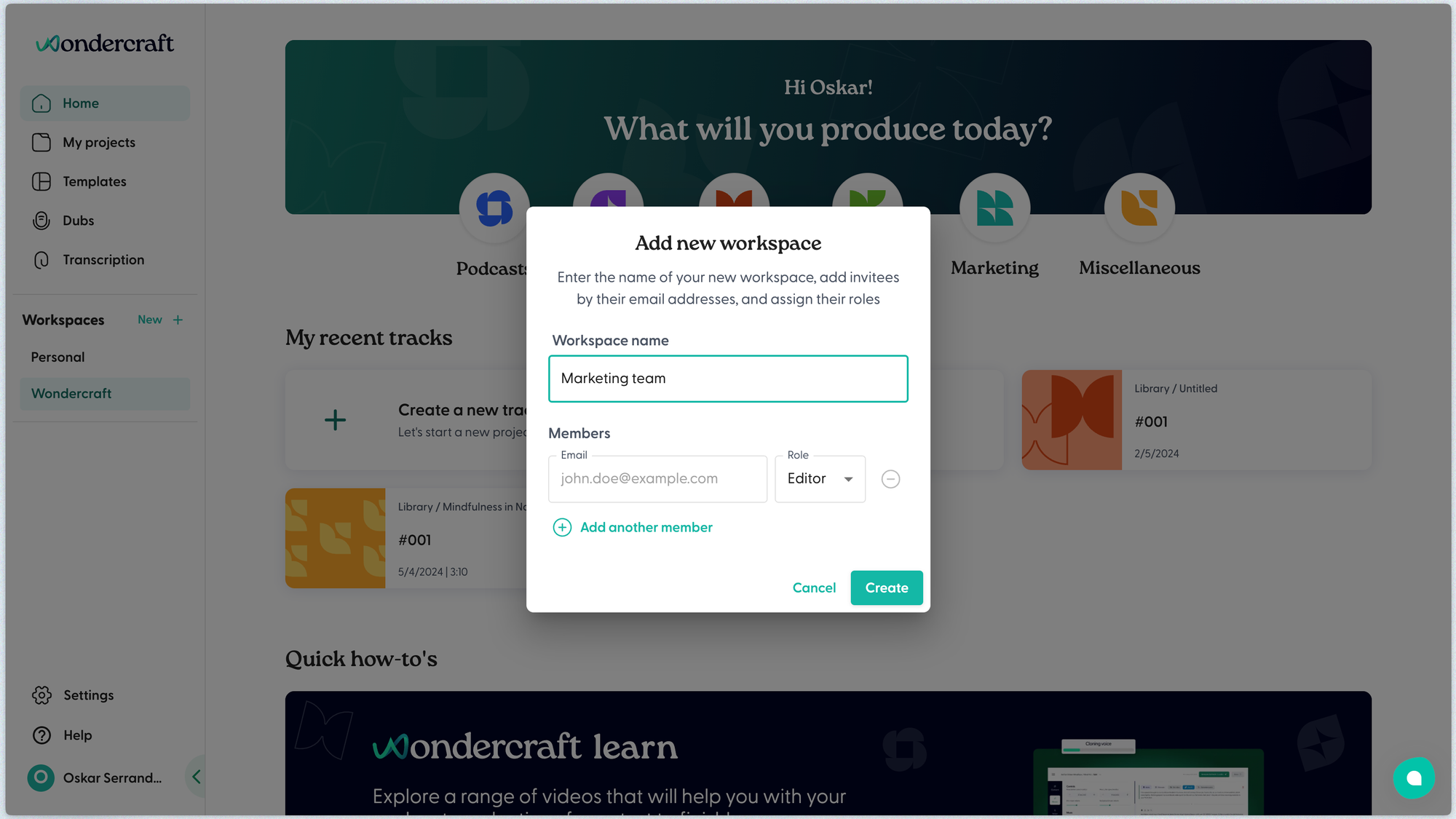 In addition to "Parrot Mode," Wondercraft is continuing to build out tooling for professional workflows. They are introducing "Workspaces," a shared space to collaborate across teams and external stakeholders like clients. In a Workspace, users can share scripts, provide real-time feedback, and upload custom voices, music, and pronunciations, streamlining the creative audio production workflow.